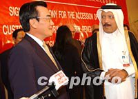 圖:WTO總干事對中國臺北加入世貿組織表示祝賀 2001年11月13日 10:08 ![]() 第四屆WTO部長級會議十二日在多哈舉行中國臺北加入世貿組織議定書簽字儀式。圖為會議主席卡塔爾財政、經濟和貿易大臣卡邁爾,WTO總干事穆爾等向臺北代表團團長林信義表示祝賀。中新社記者 錢興強 攝 |