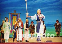 圖文:《射雕英雄傳》搬上京劇舞臺亮相南京 2001年12月12日 08:56 ![]() 武漢市京劇團根據金庸的武俠小說《射雕英雄傳》改編而成的同名京劇,十二月十日晚在南京大行宮會堂成功上演,成為第三屆中國京劇節唯一的一臺武俠劇。原著中描寫高深莫測的武功借助京劇中的“出手”及現代特技,得到了較好表現。中新社圖 劉小楚 攝