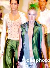 ![]() 香港時裝節展示前衛男女冬裝。“香港時裝節2002秋冬系列”的“冬日傳奇”時裝展示1月15日在香港會展中心舉行,模特在“冰天雪地”中展示香港設計師最新設計的男女前衛冬裝。中新社傳真 任晨鳴 攝 ![]() 香港時裝節展示黑紅相佩女冬裝。“香港時裝節2002秋冬系列”的“冬日傳奇”時裝展示1月15日在香港會展中心舉行,模特在“冰天雪地”中展示香港設計師最新設計的黑紅相佩的女冬裝。中新社傳真 任晨鳴 攝