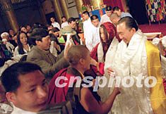 臺灣前政要陳履安長子與藏族姑娘在京喜結良緣 2002年04月28日 17:09 ![]() 圖為藏族姑娘在父親的帶領下步入結婚禮堂。王麗南 攝 ![]() 臺灣先生與西藏女認識兩月成婚。王麗南 攝 ![]() 參加陳宇廷和藏族姑娘央金拉姆的婚禮,爭相為新婚人送哈達。王麗南 攝 中新社北京四月二十八日電(記者耿軍)臺灣知名人士陳履安先生的長子陳宇廷與西藏女企業家、歌手央金拉姆喜結良緣。陳宇廷與央金拉姆的婚禮今天上午在北京飯店大宴會廳舉行。 婚禮主禮臺正后方懸掛著碩大的“解脫”二字,左右懸掛弘一大師的書法“不為自己求安樂,但愿眾生得離苦”。主禮臺上陳放有四只高大的經幢及唐卡,六位身披法衣的喇嘛分列兩側。 上午十一時,婚禮在法號聲中開始。大型投影屏幕上播放新人剪影短片,片中介紹了陳宇廷的爺爺陳誠、父親陳履安及央金拉姆一家。 當身著白色中式對襟衫的伴郎陪陳宇廷、身著藏裝的伴娘陪央金拉姆入席時,活佛帶領喇嘛唱頌吉祥祝福文。 這對新人依次獻上禮品,以報答父母、眾生、國家和三寶四重恩德,并跟隨活佛念“懺悔經”、“發愿文”。 這對新人在宣讀結婚誓約后,交換信物。陳宇廷贈予央金漢傳僧服和藏傳僧服,央金贈予陳宇廷金鋼鈴和金鋼杵。 陳履安先生代表家長向主持婚禮的活佛及來賓表示感謝。 擔任解脫服飾實業副董事長、化育文教基金會與陳誠文教基金會執行長的陳宇廷,今年三十七歲,曾獲哈佛大學企業管理碩士學位。央金拉姆是藏族女企業家和歌手,她曾在北京中央民族大學藝術系和蘭州西北民族大學藝術系就讀,近年出任奇正藏藥集團營銷副總經理。這對新人于去年在廣東中山相識。 各界人士近千人出席了今天的婚禮。 相關報道:臺灣前“監察院長”陳履安抵京參加兒子婚禮