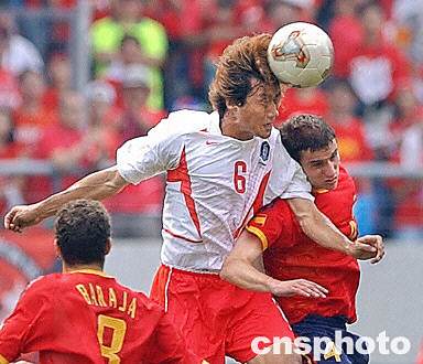 圖:西班牙VS韓國 柳相鐵飛身頂球 2002年06月22日 15:12 ![]() 6月22日韓日世界杯1/4決賽,西班牙隊VS韓國隊的比賽在韓國光州體育場進行。目前場上比分為0:0。圖為韓國隊6號柳相鐵飛身頂球。