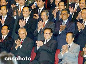 ![]() 江澤民主席會見中央駐港機構和中資機構代表。七月一日,國家主席江澤民在香港君悅酒店會見中央駐港機構和中資機構代表并與他們合影。中新社傳真 潘索菲 攝