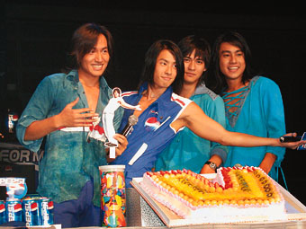 吳建豪過生日 F4和歌迷一起開心祝“大”壽(圖) 2002年08月08日 09:42 ![]() F4成員為吳建豪(左二)賀生辰 中新網香港8月8日消息:F4前日旋風襲港出席百事的首播會,其后只有吳建豪多留港一天,除了跟歌迷共慶生日外,還為新歌《聽身體唱歌》招募MV女主角,另三位成員已先行返臺灣。 據此間文匯報報道說,前晚的首播會上,吳建豪和言承旭突然走下臺與歌迷握手,引起現場一度混亂,受到歌迷的熱情感染,言承旭和朱孝天來了兩下“胸頂胸”,教歌迷看得怦然心動。吳建豪和仔仔周渝民差點被歌迷的熱情感動得掉下淚來,一些歌迷更送上生日禮物給壽星仔吳建豪。 活動完畢后,他們便拉隊到郭富城的餐聽為建豪慶祝生日,城城雖沒有出現,也送來蛋糕和鮮花。 壽星仔吳建豪昨午繼續同二百位歌迷慶祝,期間他以廣東話向在場歌迷說:“我愛你,多謝。”他又很留心看八位候選的女主角,他對各人的表現都很滿意。有位參賽者更表演一字馬,惜未能為她取得更高分。 吳建豪切生日蛋糕時,突然興奮得拿著切蛋糕的刀轉圈,似是在耍雜技,切過蛋糕后,他迅速舔一舔刀上的蛋糕。其后,他表示因在小時候沒有太多朋友,便經常拿刀當玩具般玩。 問到剛挑選出來的MV女主角,到時建豪和她可有親熱鏡頭,建豪磨拳擦掌說:“不知道,要看導演的安排,相信歌迷知道我是工作,不會生氣。”