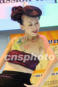 2002亞洲信息技術展覽會二日在上海浦東新國際展覽中心開幕。各參展商紛紛各顯神通宣傳自己的產品。圖為一展臺請來人體彩繪表演為自己的產品宣傳助陣。作者:湯彥俊