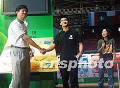 中國著名跳水運動員、二000年悉尼奧運會跳水冠軍田亮五日與安利(中國)日用品有限公司簽約,成為安利紐崔萊代言人。圖為簽字儀式上,安利大中華區副總裁顏志榮(右三)與田亮握手致意。作者:潘旭臨