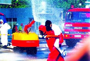 很快,消防隊員確定出染毒區和警戒區,警戒哨兵立即站到崗上,阻止車輛、人員進入染毒區域,防止二次染毒。不同類型的洗消帳篷被迅速充氣建起,中毒人員被送入其中進行洗消、救治。大水罐車噴射霧狀水流和水幕,稀釋降毒,防止毒氣向安全區擴散,掩護現場救援。