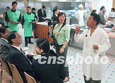 國際知名廚師、美國電視烹飪節目“甄能煮”主持人甄文達(右),九月十二日在“香港中華廚藝學院”,向三十多個美國游客介紹中華廚藝。中新社圖 張淑琴 攝