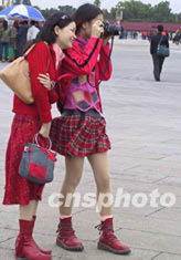 十月十八日,北京在經歷一場秋雨后氣溫驟降,最高溫度十攝氏度,最低溫度三攝氏度。在天安門廣場旅游的兩位紅裙女孩頂風冒雨仍興致盎然。作者:廖文靜