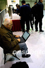 22日,一名美國(guó)記者在芝加哥奧黑爾機(jī)場(chǎng)休息室里,搶發(fā)中國(guó)國(guó)家主席江澤民訪問美國(guó)飛抵芝加哥的現(xiàn)場(chǎng)新聞。作者:王瑤