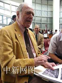 美中時間二十二日下午,在德克薩斯州農(nóng)工大學布什總統(tǒng)圖書館舉行的吉米·福克斯銅像揭幕儀式上,美國前飛行員古蒂亞回憶二戰(zhàn)期間與戰(zhàn)友福克斯支援中國抗擊日本侵略軍的情景。福克斯一九四三年在中國執(zhí)行飛行任務時墜機犧牲。作者:陳建