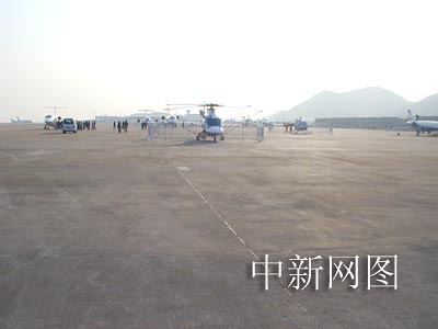 停機坪上展示直升機和豪華公務機