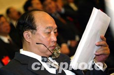 圖為財政部長項懷誠在中央國家機關代表團會場專心閱讀文件。