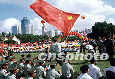 中共十六大14日下午閉幕,海口市六萬名各界人士在?谑腥f綠園聚集慶祝。作者:邱江波