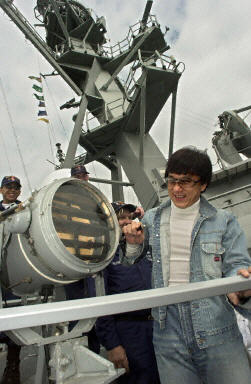 當成龍踏上甲板時,看見艦上的機槍,便二話不說跑到機槍前,向維多利亞港作狀開槍掃射,姿勢有板有眼。當參觀船上的總控制臺時,艦長教他如何駕駛,令成龍十分興奮。不少船員更自備相機,爭相與他合照。由于盛情難卻,成龍一口氣為逾百船員簽名。