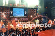 當上海以絕對優勢獲得二○一○年世界博覽會主辦權的消息傳來,上海南京路世紀廣場頓時成了歡樂的海洋。四面八方聚集而來的上海市民,揮舞著手中印有世博會徽標的各色旗幟和國旗,盡情地歡呼。作者:姜煜