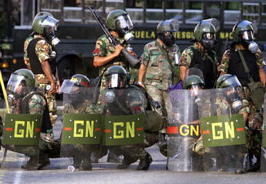委內瑞拉反對派2日發起全國總罷工,并威脅要走上街頭進行抗議,要求委內瑞拉總統查韋斯下臺。由于委內瑞拉石油公司附近早已被官方宣布為軍事禁區,因此反對派此舉直接引發了示威者同負責在軍事禁區維持治安的國民警衛隊之間的沖突。圖為負責維持首都治安的國民警衛隊。