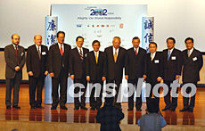董建華與香港商政領袖簽署誠信協(xié)議。二零零二年領導論壇“商政領袖面對的誠信挑戰(zhàn)”十二月十二日在香港舉行,香港特區(qū)行政長官董建華(右五)、公務員事務局局長王永平(左五)及廉政專員李少光(右四)等在該論壇上簽署誠信協(xié)議。潘索菲 攝