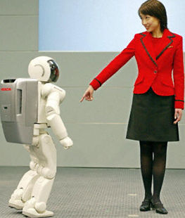 本田汽車公司在東京總部展示了具有人形特質的代號“ASIMO”的機器人,該種新型“ASIMO”機器人與示范小姐作出各種互動回應,識別接近它的人,跟隨她,按照指示方向移動。