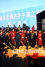 新世紀中國第一個大工程——南水北調東線山東省段濟平干渠工程,二十七日于山東省濟南市長清區孝里鎮北貴平莊的山口起爆開工。中共山東省委書記、省長張高麗,國家發展計劃委員會副主任于廣洲,國家水利部副部長翟浩輝等為工程奠基。作者:王魯平