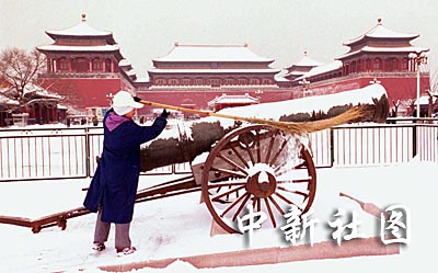 北京連續六天降雪創下百年紀錄。二十四日,京城終于雪過天晴,一位保潔工人正在故宮午門前清掃神威大炮上的積雪。作者:張煒