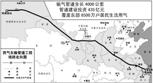 作為中國最長的管道工程和實施西部大開發戰略的標志性項目,西氣東輸管道工程于2002年7月4日開工。該管線的建成將使中國的天然氣產量增加50%,使天然氣占全國一次能源結構的比重由2.1%提高到3%。