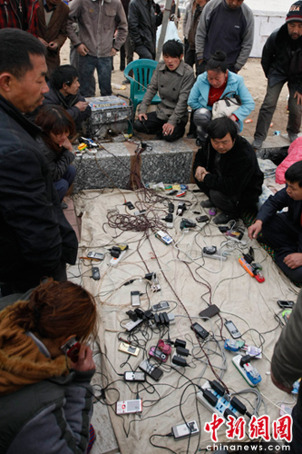 志愿者自帶發(fā)電機(jī)為受災(zāi)民眾手機(jī)充電