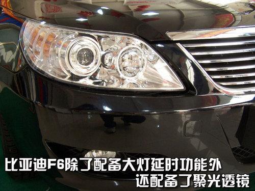 比亞迪F6長4846mm,寬1822mm,高1465mm的車身,2740mm的軸距,提供寬敞舒適的的駕乘空間;同時也提供了高端配置。例如在駕乘舒適性方面,F6新財富版2.0L尊貴型擁有雙層雙模天窗、雙溫區獨立控制自動空調、方向盤音響控制系統、DVD多媒體系統以及NAVI語音導航系統等配置。