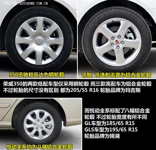 榮威350在高低配車型上有兩種不同的輪轂,但輪胎的尺寸都是205/55 R16。而悅動則是全系標配8幅鋁合金輪轂,但在低配車型上僅使用了185/65 R15輪胎,而高配車型上將輪胎的寬度升級到195。從效果上看,榮威350更寬更大的輪胎顯然更漂亮,但悅動標配鋁合金輪轂更厚道一些。