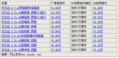 豐田漢蘭達(dá)有著寬大的車身,擁有創(chuàng)新的、寬敞的內(nèi)部空間,并配備了豪華、舒適的內(nèi)飾。而且,漢蘭達(dá)標(biāo)配了同級(jí)別車型中最高標(biāo)準(zhǔn)的安全裝備。這款SUV行駛中非常安靜,而且靈敏性超凡,將多功能性和駕駛舒適性匯于一身。根據(jù)網(wǎng)上車市價(jià)格監(jiān)測(cè)系統(tǒng)顯示,目前廣汽漢蘭達(dá)最高優(yōu)惠現(xiàn)金8千元,最低售價(jià)27.28萬(wàn)元,車源較緊張,詳細(xì)價(jià)格如下表: