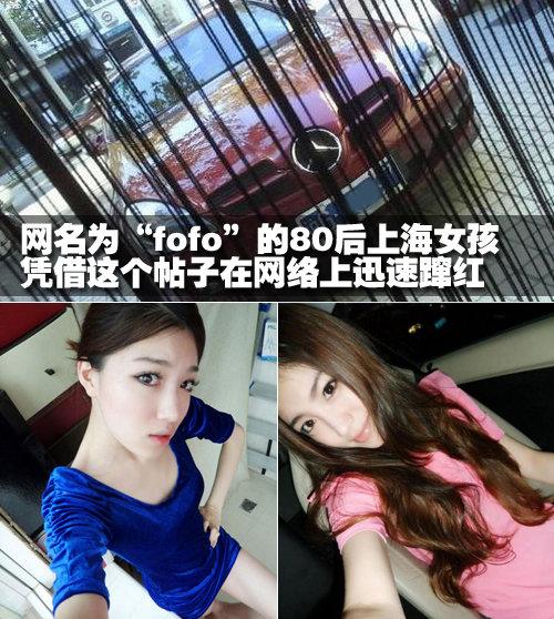一個網名為“fofo”的80后上海女孩在某知名論壇中發帖《曬曬我的大奔,你們有嗎?!》,并且貼出了不少靚照,曬自己的奔馳SLK和奢靡生活。就這樣一個帖子,在短短2小時內被蓋到100樓,點擊率高達了近10萬,并被很多網友轉載到各大論壇,成為最熱點的帖子。
