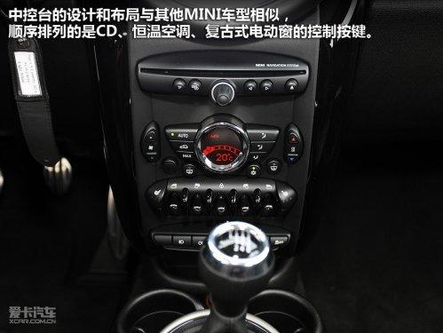 中控臺的設計和布局與其他MINI車型相似,從上而下順序排列的是CD、恒溫空調、復古式電動窗的控制按鍵,最下面一排的位置則有些別扭,霧燈與ESP、運動模式等系統的開關需要仔細觀察才能按準。