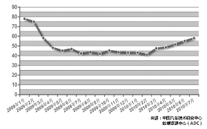 在產銷下滑的同時,庫存開始上升。7月份,汽車庫存周期逐月增長勢頭依然延續,由6月份的55天增加到58天。其中,乘用車庫存周期由57天增加到60天,商用車庫存周期由49天增加到50天。