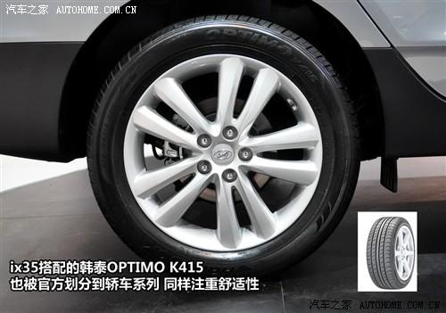韓泰OPTIMO K415也被官方劃分得到轎車輪胎系列,看來現代ix35的確不適合在野地里行駛,從選用的輪胎上就能看出,該車更多突出的的是舒適性。采用米其林輪胎的車型暫時還沒有見到,不知道是采用的哪款型號。另外,ix35的備胎也為全尺寸鋁合金輪轂的,沒有縮水。