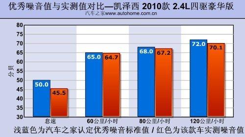 在一條平直無車的高速公路上,我們測得凱澤西的噪音值為:怠速45.5分貝;60公里/小時64.7分貝;80公里/小時67.2分貝;120公里/小時70.1分貝。這樣的水平在同級別中算是比較安靜的,完全不輸于那些以舒適性見長的車型。