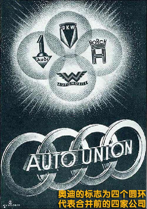 這四家公司對當時德國汽車工業的進步做出了杰出的貢獻。這四家汽車公司于1932年合并為汽車聯盟股份公司(auto union ag)。從汽車產量來說,汽車聯盟是當時德國第二大汽車制造公司,商品標志為四個連接的圓環,代表參與合并的四家汽車公司。世界上也就首次出現了四環標志。