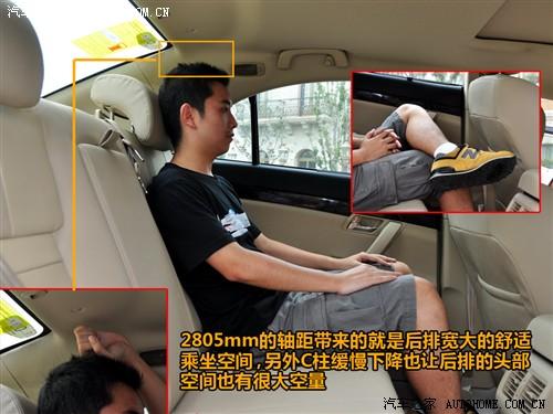 得益于2805的軸距,這款車讓后排乘客可以擁有相對充足的腿部空間,翹起二郎腿還是沒問題的,不過稍微費點勁!另外,后排的地板比較平,因此如果后排中間坐人的話,腳不會太別扭!