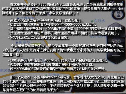 當然,服務費用相對貴這與榮威350的關系并不太大,這里只是建議在使用這套3G系統的時候注意流量與費用之間比例的關系,畢竟這收費最終受益人是聯通,而作為第一個將3G系統引入到真正民用型轎車而言,這套系統的實用性不言而喻,至少老百姓也可以隨時隨地享受品牌隨時隨地的便捷服務了。