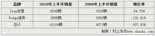 Jeep吉普和Dodge道奇兩大品牌在2010年上半年銷量已經(jīng)超過2009年全年的總銷量。2010年上半年Jeep吉普品牌車型銷量達6248量,較去年上半年增長了94.7%。