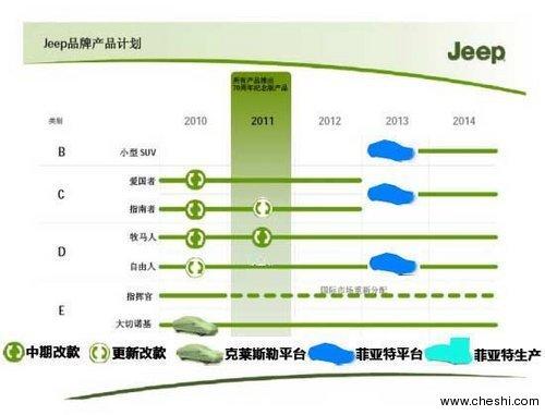 通過Jeep近兩年的產(chǎn)品規(guī)劃圖可以看出,Jeep自由人將于2013年開始使用菲亞特生產(chǎn)平臺前,而且在明年還將推出新款自由人。Jeep牧馬人將于明年推出70周年紀念版車型,并且一直持續(xù)生產(chǎn)。除Jeep指揮官將于2010年末停產(chǎn)外,Jeep大切諾基將繼續(xù)保持克萊斯勒血統(tǒng)一直生產(chǎn),并且新款大切諾基將于今年年底引入國內。