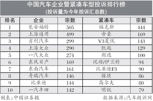 汽車投訴網(wǎng)本期緊湊車型投訴榜上榜名單與上期相比變化不大,一汽大眾高爾夫和上海大眾斯柯達明銳分別以80宗和79宗投訴進入前十名單。在高爾夫80宗投訴中,有超過8成是投訴4S店未能按時交車,這也成為目前唯一一個因非質(zhì)量問題而進入前十投訴名單的車型。賽拉圖和東風(fēng)標(biāo)致307則退出緊湊車型投訴榜前十名行列。福克斯則比上期增加92宗,繼續(xù)高居緊湊車型投訴榜榜首,與第二名的差距也增加至近300宗,與第十名更是有5倍的差距。
