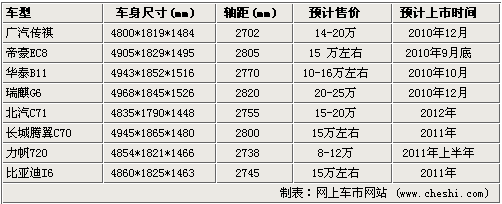 從上表可以看到,這八款新車型瑞麒G6的尺寸最大,車長2968mm、軸距達2820mm,其次是長城騰翼C70,而最先推向市場的很可能是帝豪EC8,預計售價15萬左右,搭載2.0L和2.4L發動機。剛剛下線的傳祺將于廣州車展上市,預計售價14-20萬元之間。