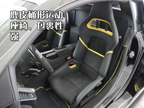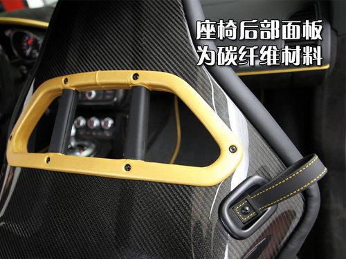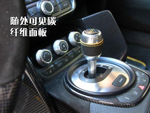 車廂內(nèi)飾運(yùn)用灰色和金色雙色搭配,桶形運(yùn)動(dòng)座椅為PPI特別定制,主要乘坐區(qū)域?yàn)轺淦ご蛟臁L貏e值得一提的是座椅后部支撐面板也是碳纖維材料制成,中控和方向盤等地隨處可見碳纖維裝飾面板。
