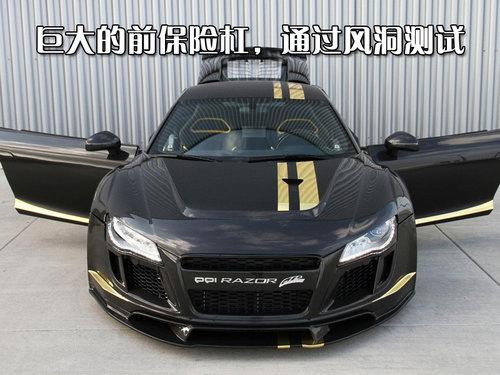 PPI打造的改裝版R8命名為RAZOR GTR-10,這個(gè)名字中的10意味只限量改裝10臺(tái)。RAZOR GTR-10是一款高性能全碳纖維輕量化超級(jí)跑車,前臉換裝了巨大的碳纖維運(yùn)動(dòng)前保險(xiǎn)杠,完美的運(yùn)用了空氣動(dòng)力學(xué)并通過了風(fēng)洞測(cè)試。前備箱蓋一側(cè)有兩條金色賽道紋貫穿車身前后。