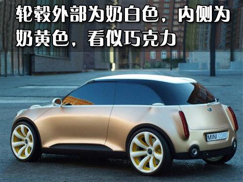 MINI Core概念車采用內凹陷七幅白色輪轂,內側噴涂的是奶黃色,造型非常可愛就如由巧克力制成一樣。