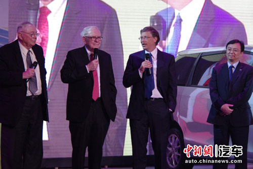中新網9月29日電 29日,比亞迪M6在全國近30站分站上市的收官之作在京舉行。在300多家媒體苦等將近兩小時候后,12點20分,股神巴菲特、伯克夏哈撒韋公司副主席查理·芒格、微軟前董事長比爾·蓋茨同比亞迪總裁王傳福乘坐M6現身發布會。
