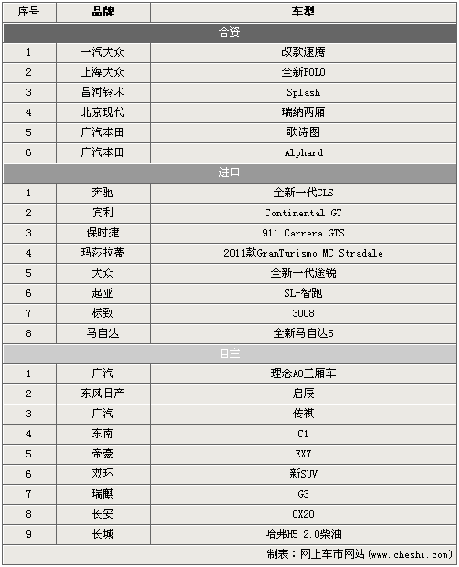 從表中可以看出,在2010年第四季度(10-12月)共有23款新車將于消費者見面。合資品牌品牌共有6款車型登場,上海大眾的全新POLO和廣汽本田的歌詩圖是關注度相對高的兩款明星車型;進口陣營中奔馳全新CLS已經被炒得非常火熱,而售價低很多的起亞SL-智跑則會引起共多SUV愛好者的注目;自主幫派以9款新車雄居榜首,第四季度這部分的特點在于有全新的品牌加入戰局,廣汽、東風等合資品牌都將下一步的計劃投身到自主品牌的浪潮之中。