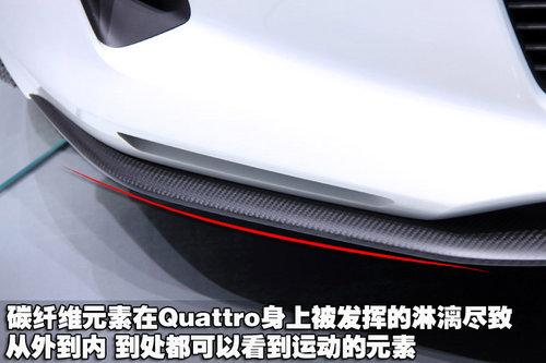 碳纖維元素在奧迪Quattro概念車身上隨處可見,車頭部位只是低調的在小包圍上用到了這一元素,等一會到車尾和內部,大家就會認可隨處可見這個詞,因為,奧迪Quattro概念車身上真的配備了很多碳纖維面板。
