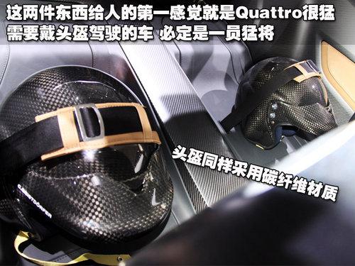 座椅后面是兩塊小型除霧空間,不過這里配備了兩個頭盔。沒錯,駕駛奧迪Quattro概念車是需要頭盔的,因為它是在太快太強,頭盔的面料同樣采用碳纖維設計。