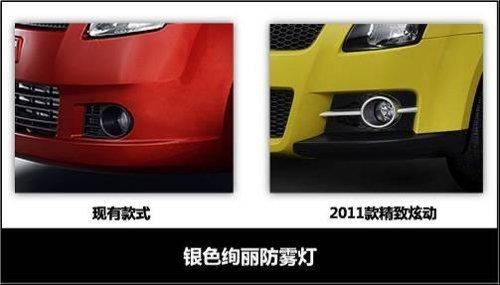 2011款雨燕在外型上與現(xiàn)款車型相比有了很大突破,甚至能夠稱之為運(yùn)動(dòng)款,運(yùn)動(dòng)元素遍布整個(gè)車身。前大燈、霧燈裝飾、前保險(xiǎn)杠、進(jìn)氣格柵均進(jìn)行了重新設(shè)計(jì)。前臉上巨大的進(jìn)氣口和黑底的前大燈顯得酷勁十足且更具侵略性;霧燈區(qū)域的變化也很搶眼,原本與條紋格柵相一致的黑色霧燈經(jīng)過(guò)銀色裝飾后,視覺(jué)沖擊力更強(qiáng)。車身側(cè)面增加了空氣動(dòng)力學(xué)側(cè)圍裙邊,動(dòng)感魅力更加明顯。
