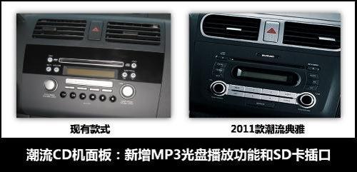 內(nèi)飾方面,銀色成為雨燕2011款內(nèi)飾的主色調(diào)。方向盤采用點(diǎn)狀皮紋,真皮觸感;經(jīng)過(guò)重新設(shè)計(jì)的CD面板,按鍵布局更加合理,按鈕與銀色按鍵組合協(xié)調(diào)。CD還新增了MP3光盤播放功能和SD卡插口,可以播放多種格式音樂(lè)。